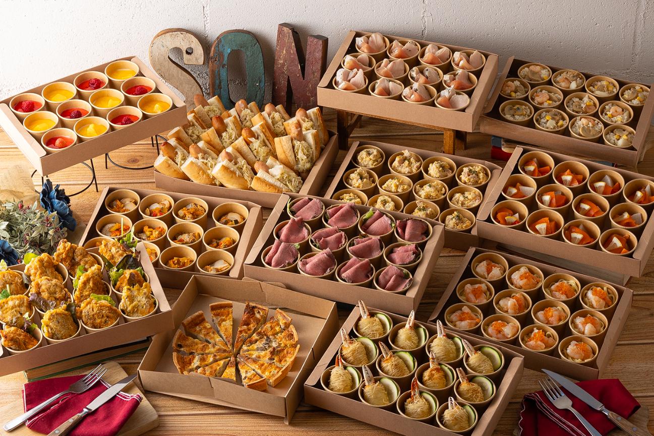 品目 | ・スモークサーモンポテトサラダ ・⾃家製ローストビーフ ・フライドチキン ・鶏⾁のハーブロースト ・カプレーゼ&ペンネ ・海鮮⼤焼売 ・あんかけ⾁団⼦ ・ロールパンサンドイッチ |