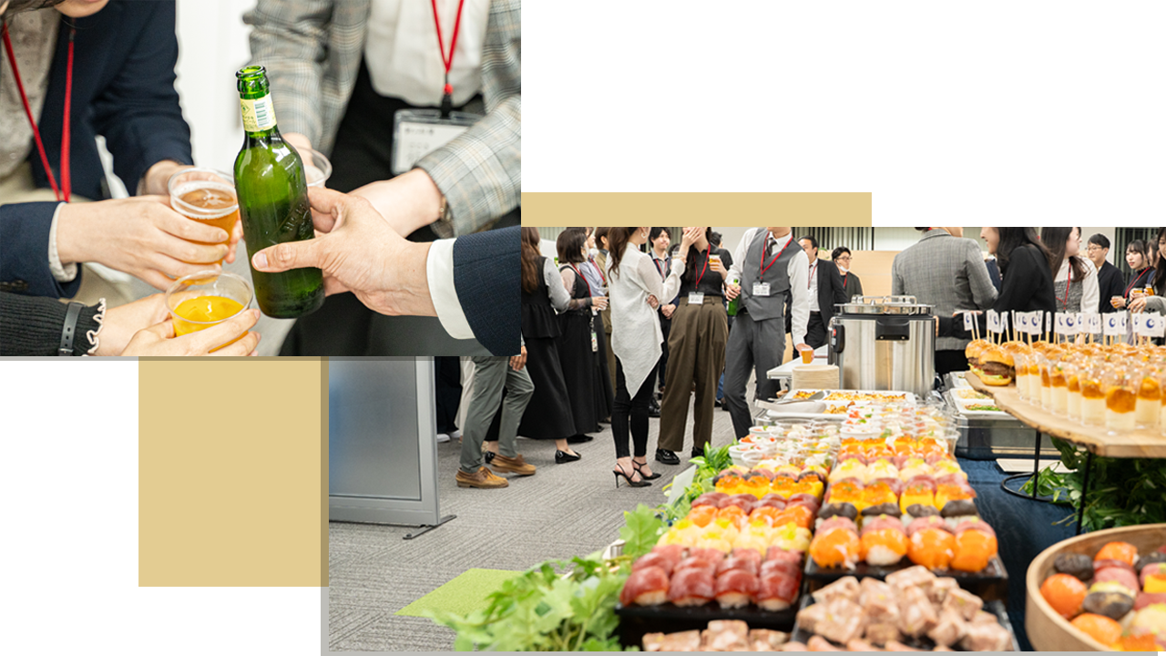 会話を基調とした立食形式や、それに相応しい食べやすいフィンガーフード(フォークやナイフを使わずに、指でつまんで手軽に食べられる一口サイズの料理のこと)など、交流しやすいスタイルを選べるため、部署横断のコミュニケーションが促進。