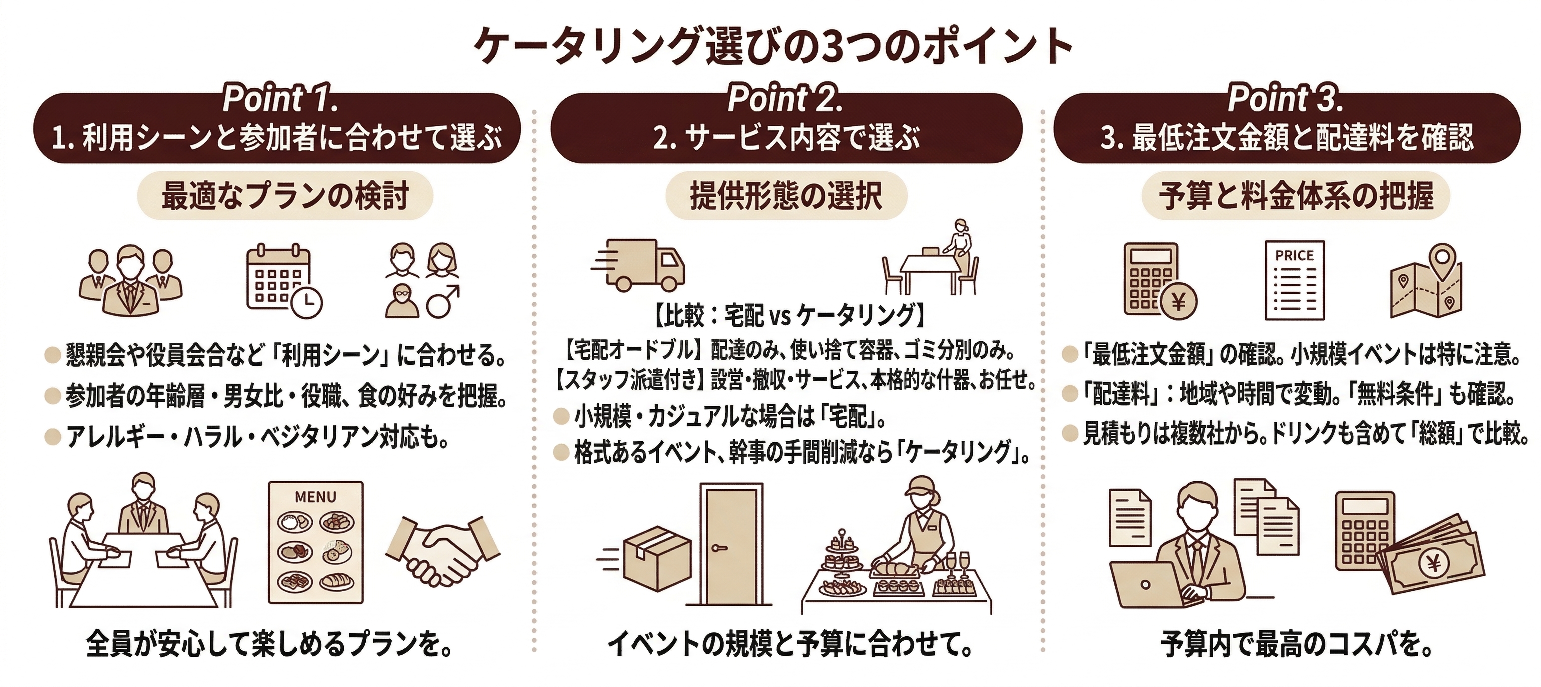 Step 2:プラン決定・注文 | 見積を比較して業者を確定し、正式に注文する。 | ・支払い方法(請求書、カード等)・キャンセルポリシー、人数変更の期限 |