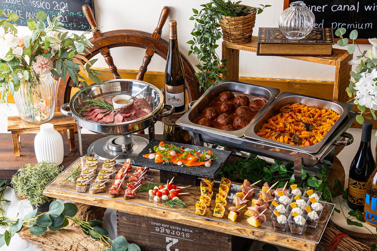 ◆MENU(全10品) 【フィンガーフード】 5品 ・ハモンセラーノ&サルシッチョン(生ハム&サラミ) ・有機ほうれん草とドライトマトのキッシュ ・パテドカンパーニュ ・イタリア産チーズの彩りカプレーゼ ・鴨の紅茶スモークとじゃがいものフリット 【冷製料理】 1品 ・スモークサーモン、クリームチーズとケッパーベリー 【温製料理】 3品 ・淡路牛ハンバーグ 熟成デミグラスソース ・自家製ローストビーフ 根野菜のソース ・シェフ特製パスタ フジリ 【スイーツ】 1品 ・ガトーショコラ |