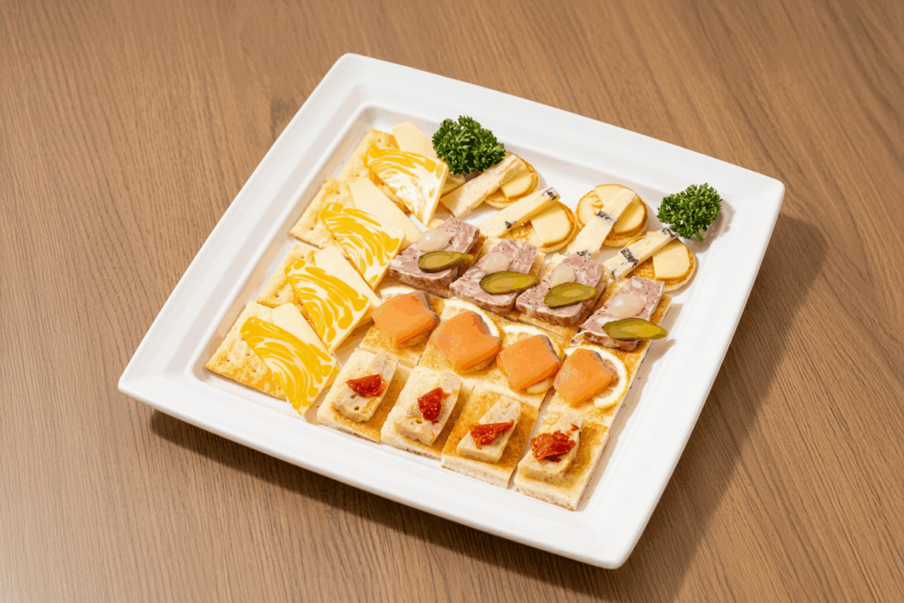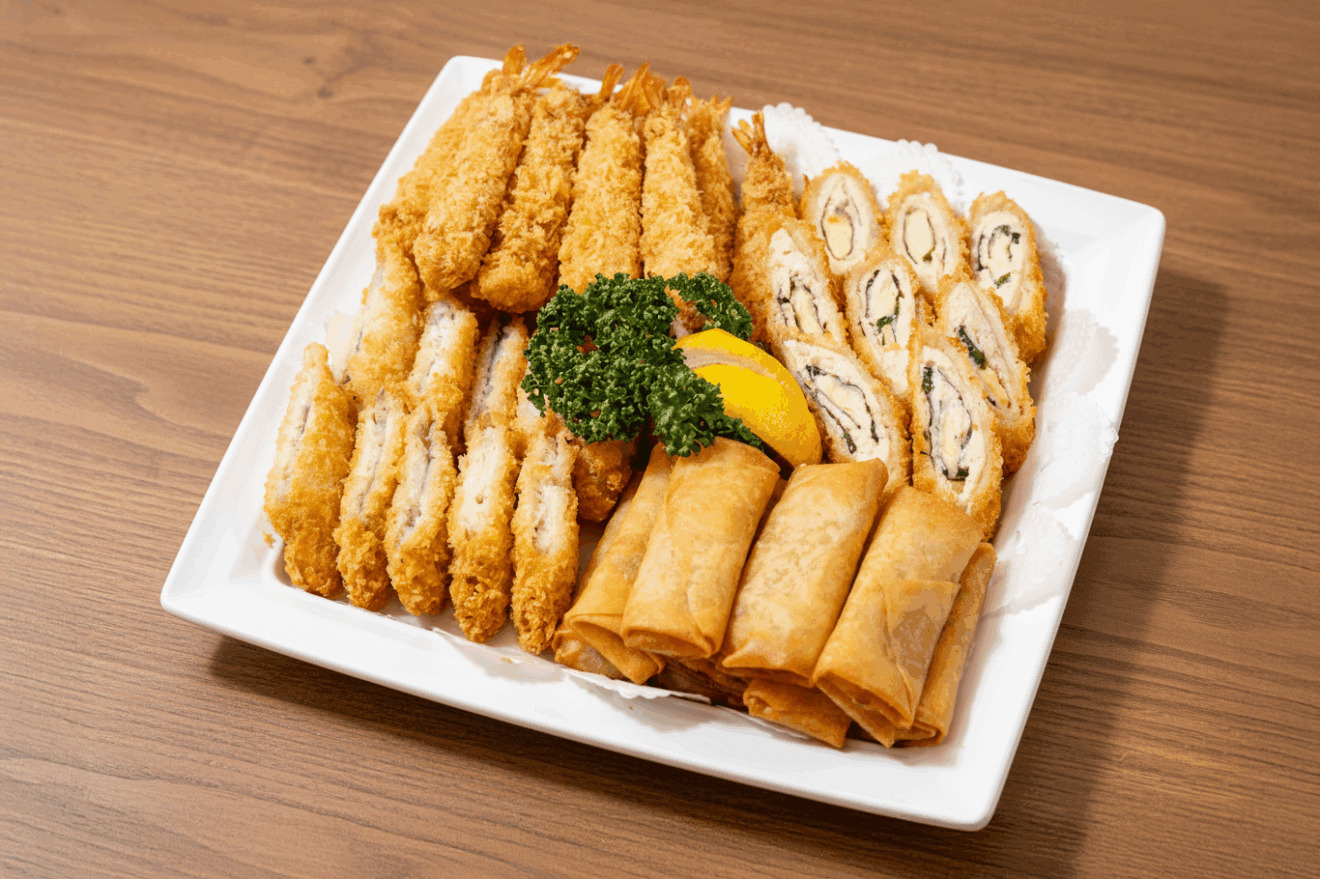 【MENU】 ・洋風フライ盛り合わせ(海老フライ・ささみチーズフライ・白身フライ・春巻き) ・カナッペ盛り合わせ ・チーズ盛り合わせ ・ミックスサンドイッチ ・フライドチキン&フライドポテト ・ローストポーク ・冷製パスタ(トマト・生ハム・オリーブ入) ・握り寿司 ・プチキッシュ&タルトレット ※季節毎の仕入れによりメニューが変わる場合がございます。予めご了承ください <分量> 各1~2ピース/サンドイッチ3ピース/冷製パスタ40~50g(1名あたりの目安) 【備品】備品一式:紙取皿、割箸、紙おしぼり、ゴミ袋 |
