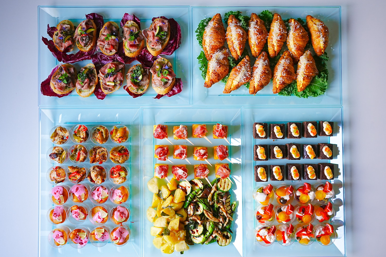 ひとり全メニューが1ピースずつ12品目分召し上がれる量です。 ①スパイシーケイジャン海鮮稲荷 ②国産和牛ローストビーフ旬野菜マリネ添え ③サム醬クリームチーズ手毬ずし ④生ハムのジェノバオープンサンド ⑤海老のビーツチリマヨネーズソース ⑥グリルチキン オレンジ粒マスタード ⑦季節野菜のハーブクリームオープンサンド ⑧2層のスイートポテトサラダ ⑨ラグジュアリー海鮮稲荷 ⑩タコス風ライスペーパーチップス ⑪フランボワーズガトーショコラ ⑫フルーツスフレチーズケーキ 【付属品について】 無料付属はございませんのでオプションからの選択をお願い致します。 紙皿、箸、紙ナプキン別途¥110/人でご用意いたします。 ※メニューは仕入れにより、一部変更になる場合がございます。 ※ベースは写真のデザインでの設置になりますが、テーマやコンセプトにより装飾を追加,変更希望される場合はご相談ください。 ※企業様のカラーにあわせた食材の色味などのデザイン調整も可能ですのでお気軽にご相談ください。 |