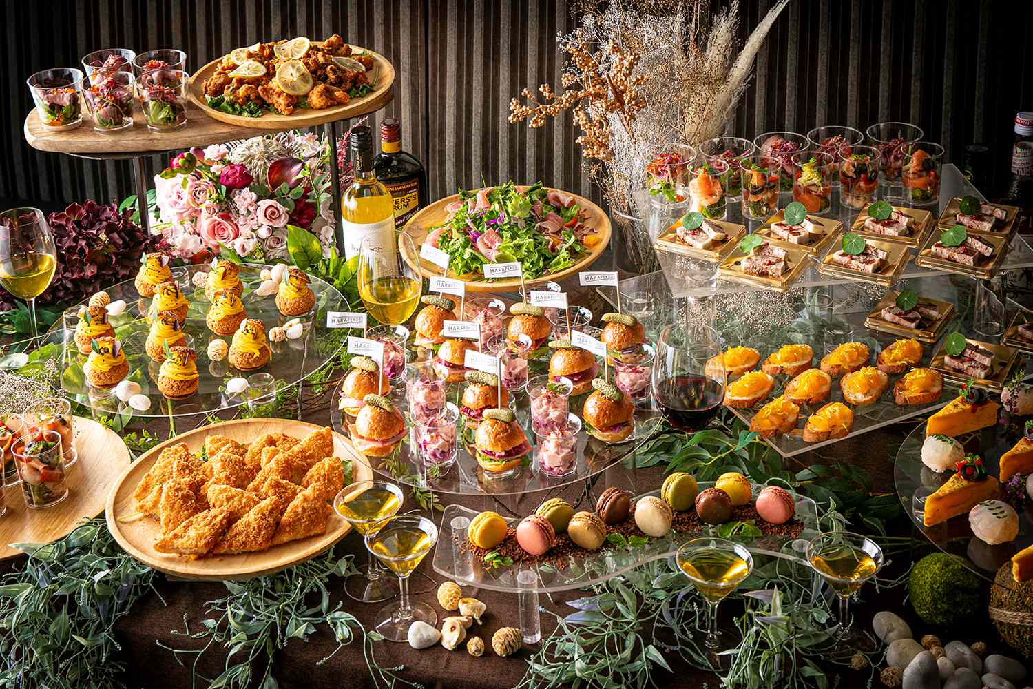 【大皿料理】 ①季節の彩りサラダ ②季節のフライメニュー 【フィンガーフード】 ③パテドカンパーニュ ④スペイン風オムレツ ⑤本日のクロスティーニ ⑥ミニスライダー ⑦海鮮手毬寿司 【カップ】 ⑧海老&サーモンの彩りマリネ ⑨ビーツのポテトサラダ ⑩紫キャベツと自家製ローストビーフ 【スイーツ】 ⑪季節のハイクオリティーシュー ⑫ガーデンブラウニーと彩りマカロン 【ドリンクメニュー】 缶ビール※物量の都合上、おひとり缶ビール(350ml)2本目安です。 ウイスキー/ハイボール レモンサワー 焼酎(芋、麦) ウーロン茶 オレンジジュース 炭酸水 ミネラルウォーター |
