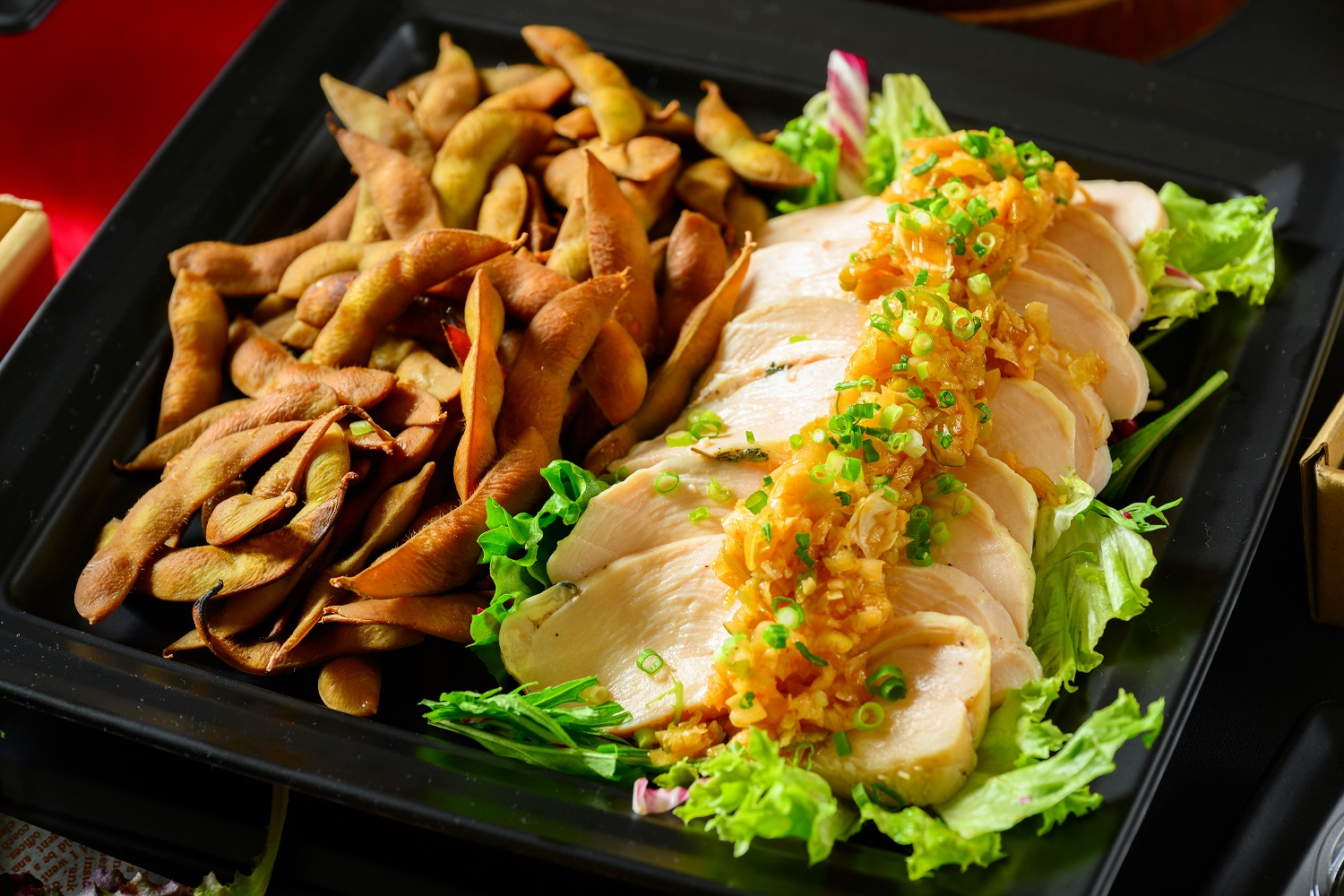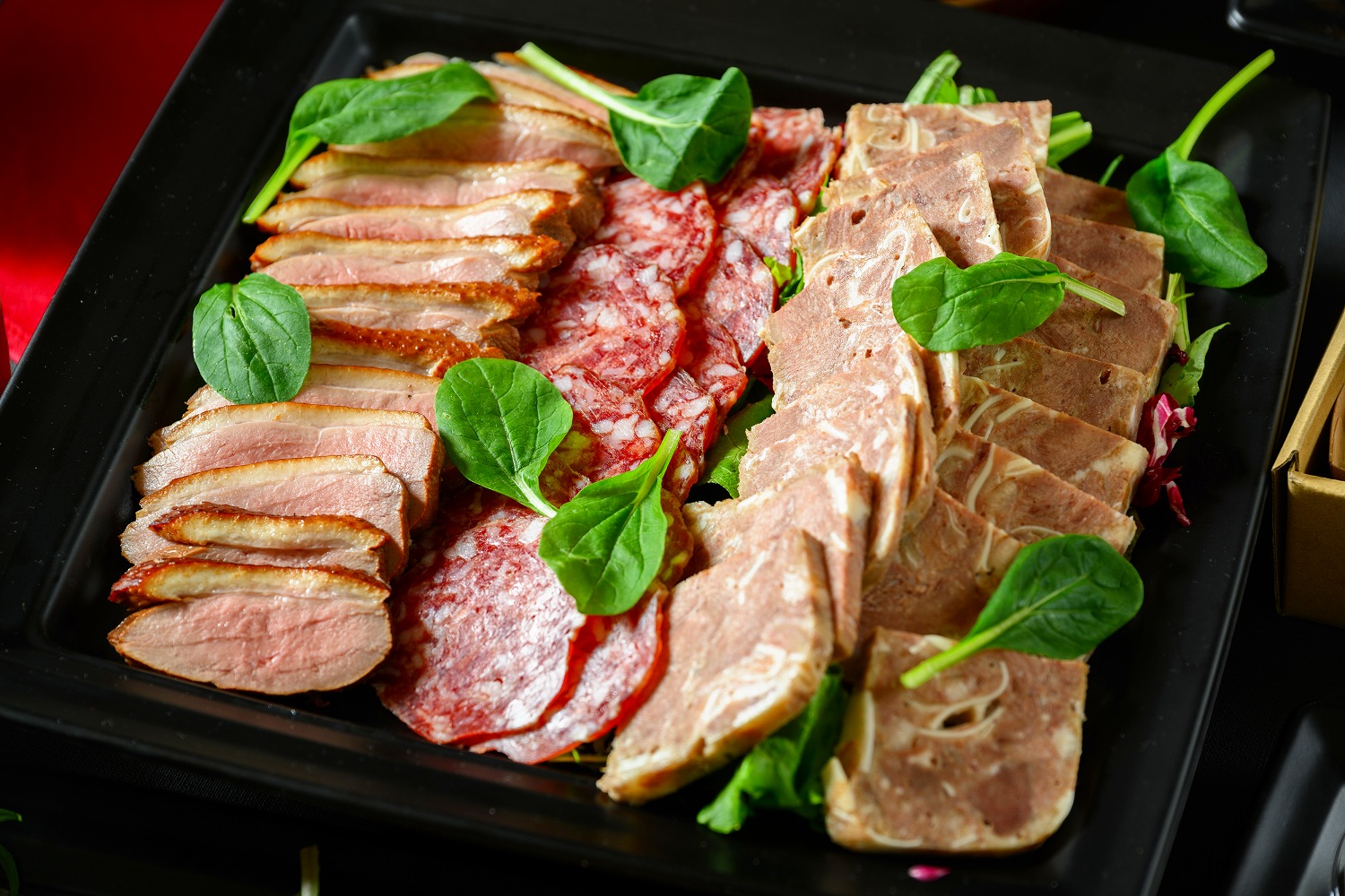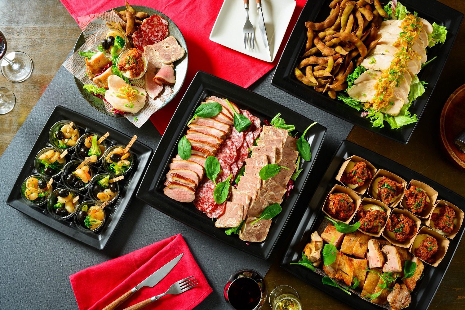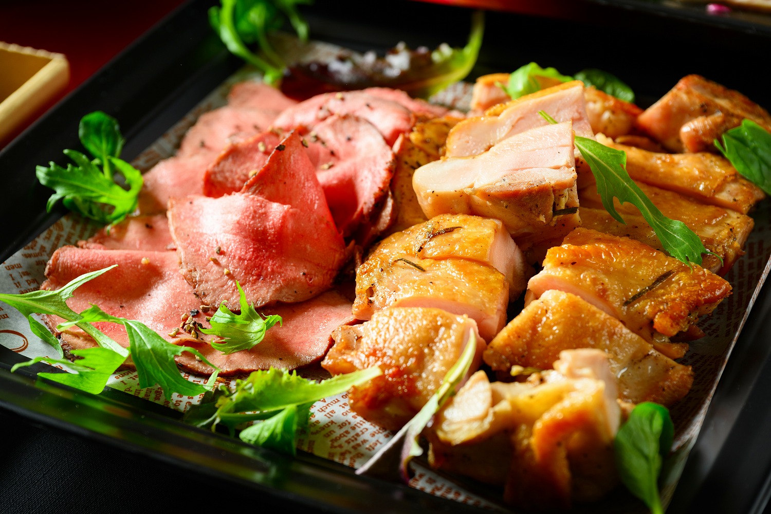 【肉料理~メイン3品~】 ①道産合鴨の自家製スモーク ②ローズマリー香るローストチキン ③牛タンのローストビーフ 【肉料理~前菜3品~】 ④フランス産サラミ ⑤豚耳と豚舌のテリーヌ ⑥自家製鶏ハムのよだれ鶏 【前菜・副菜3品】 ⑦枝豆のスモーク ⑧タコとオリーブのマリネ ⑨ミートポテサラ 【春のプラスワン】⑩苺のケーキ ※紙おしぼり・取り皿・割箸は人数分無料、取り箸サービス |