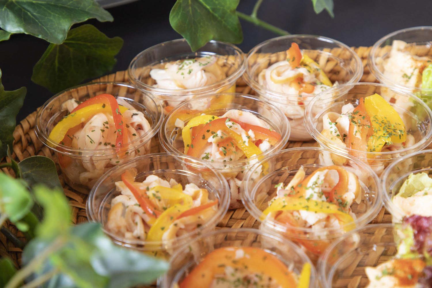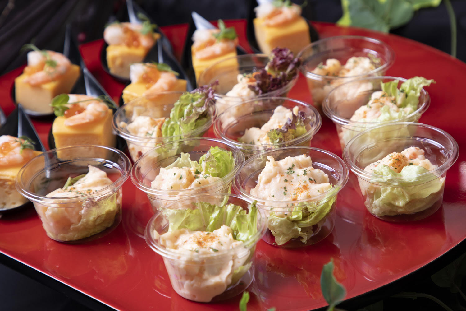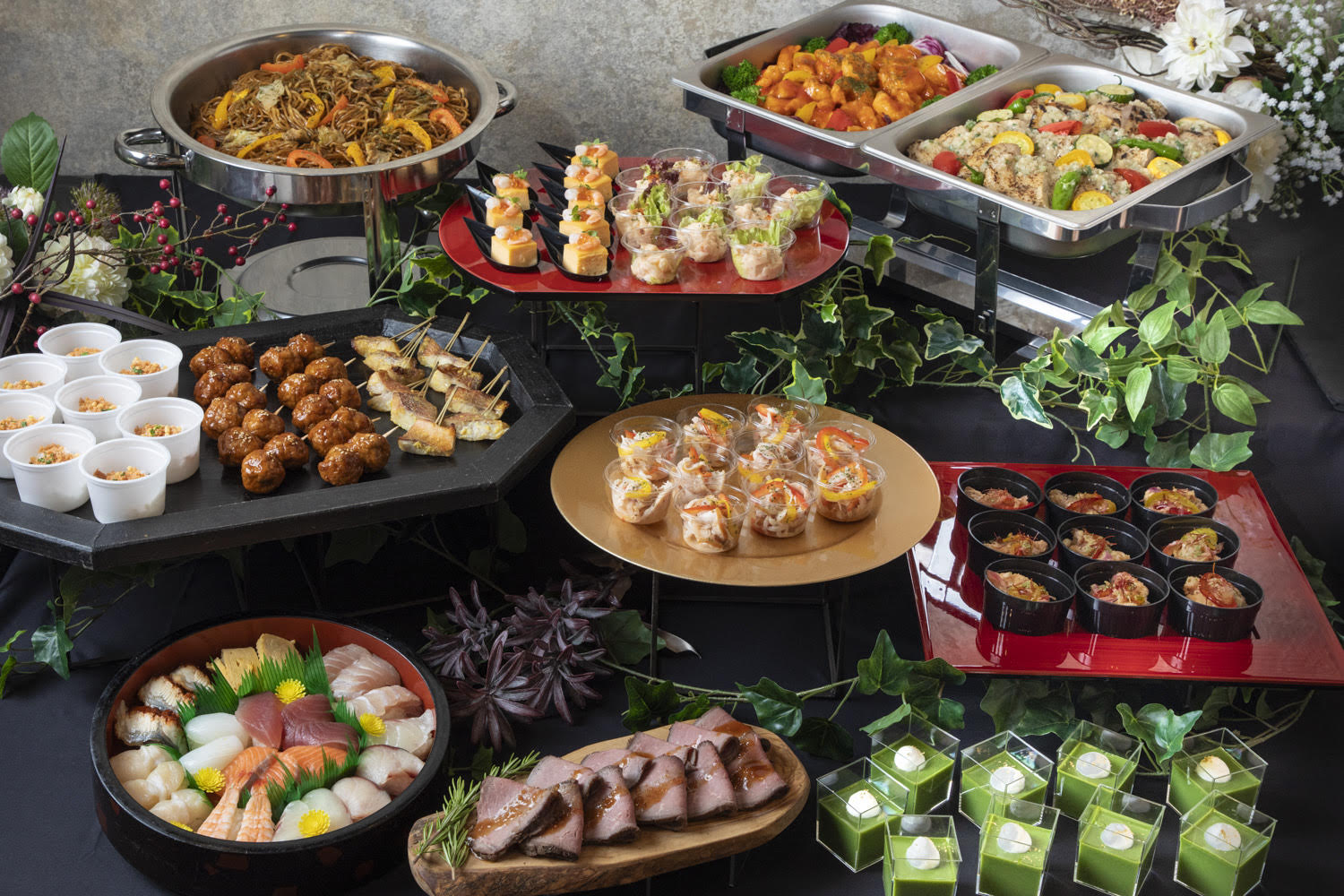 【冷製】 ①ローストビーフ ホースラディッシュジュレソース ②季節の1品~スモークチキンの彩りマリネ~ ③明太ポテサラ ④お魚のカルピオーネ ⑤軟骨入り鶏つくね串 ⑥出汁茶漬け(こちらの商品に変更可能、巻きずしor茶そば) ⑦自家製だし巻き玉子〜いくら、海老添え〜 ⑧握り寿司(お一人様3貫想定) ⑨和デザート盛り合わせ 【温製】 ⑩屋台風焼きそば ⑪エビチリ ⑫グリルチキン~塩ねぎソース~ ※本プランの温製料理については発熱材での加熱が可能です。 |