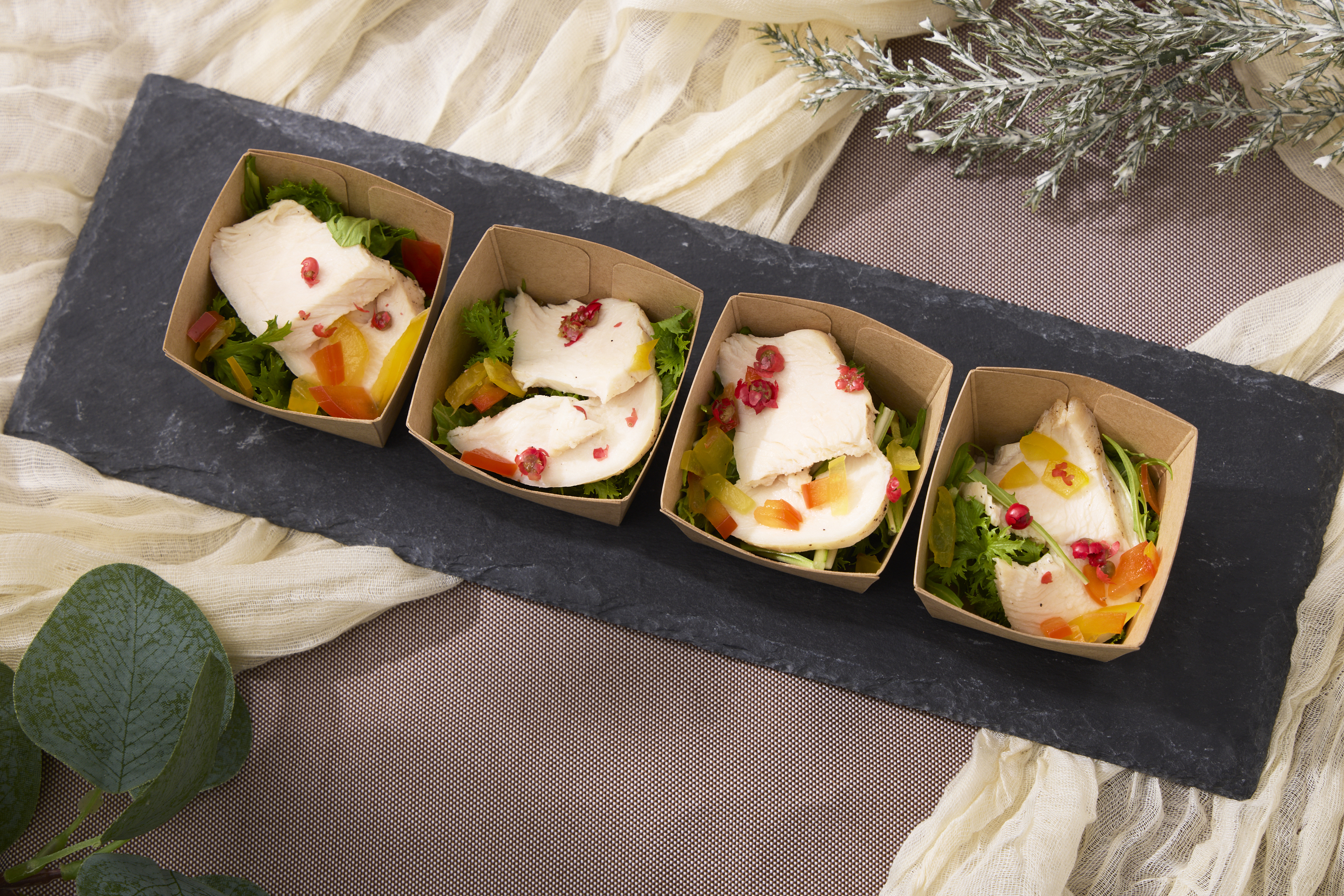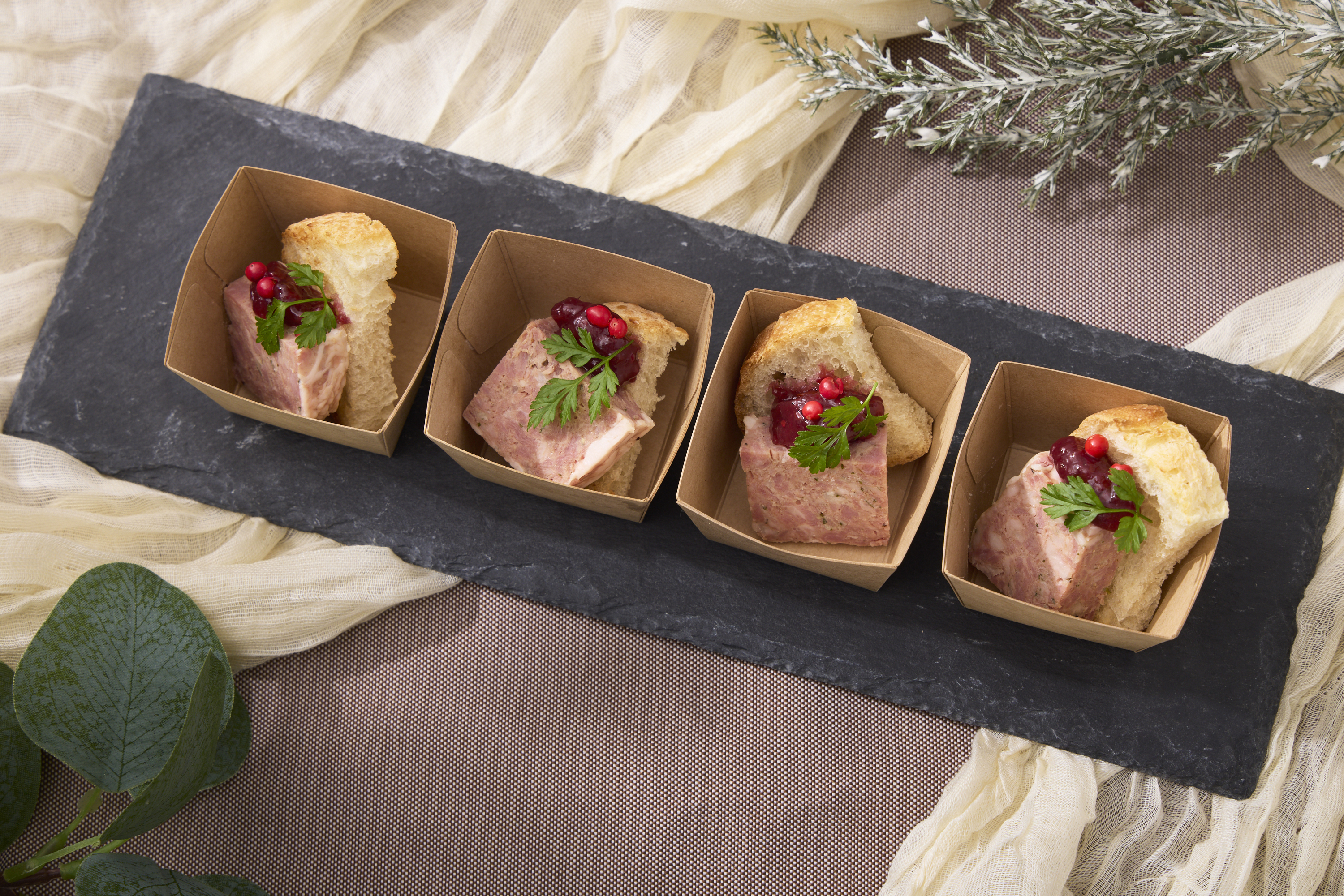 【全12品】 ・彩り野菜のマリネ レモンの香り ・スペイン風チーズオムレツ ・パテドカンパーニュとフルーツのコンフィチュール ・自家製鶏ハムのサラダ ・地鶏のコンフィ ・ローストビーフ トリュフ香るソースで ・鴨のローストとフルーツのマリアージュ ・海老とブロッコリーのバターライス ・スモークサーモンのマリネ ・農園から届いたトマトのカプレーゼ ・ベーコンのアラビアータ ・季節のケーキ ※使い捨ての容器にてお料理をお届けするプランです。 ※ゴミの回収、スタッフのセッティング等はございません。 |