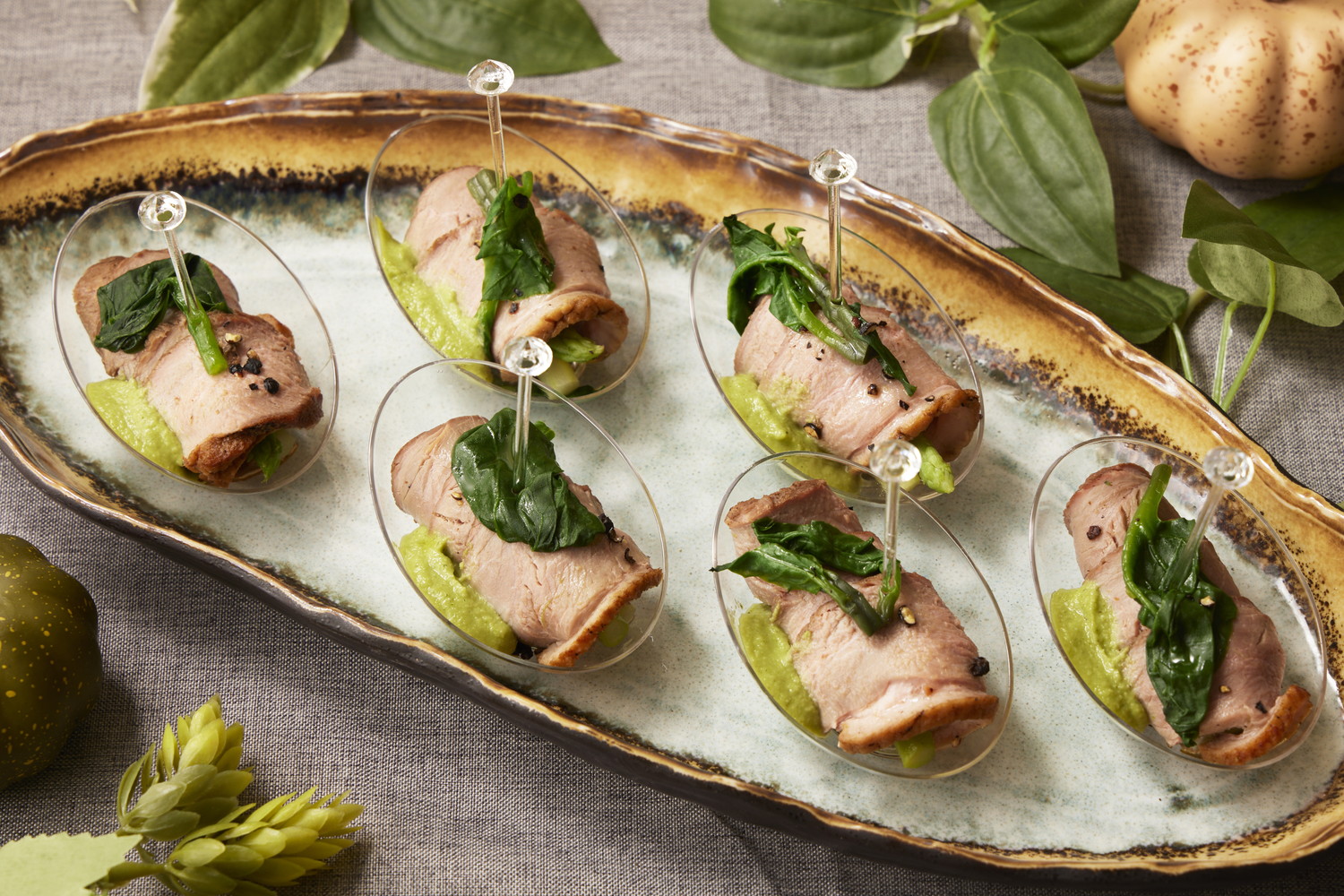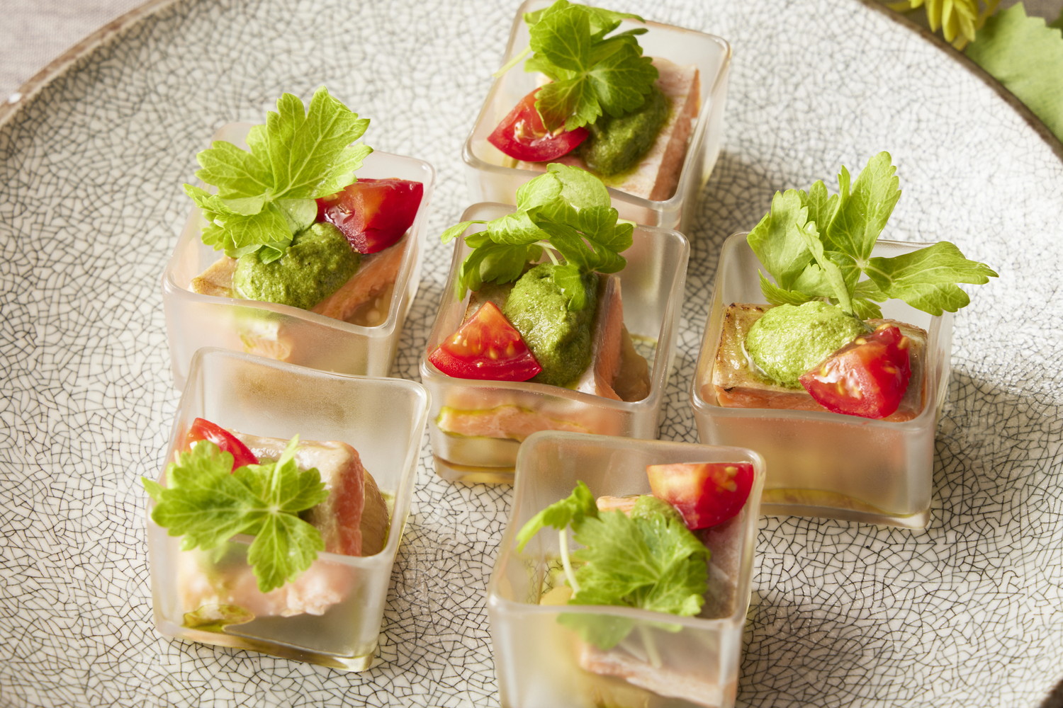 【料理メニュー 13品】 ①燻製ベーコンのミモザ風ポテトサラダ ②旬の野菜&果実・マスカルポーネのカナッペ ③スパニッシュオムレツのカラフルピンチョス ④シェフ特製・パテドカンパーニュ ⑤海老と生ハム・季節野菜たっぷり生春巻き チリソース添え ⑥白身魚の和風甘酢あんかけ ⑦季節野菜と飴色玉ねぎのキッシュ ⑧ハーブ香る合鴨ロースの柔らか一口チーズカツレツ ⑨シェフ特製キンパ(韓国風海苔巻き) ⑩)若鶏もも肉の濃厚クリームシチュー バケット付き ⑪たっぷり茸と魚介のペンネペスカトーレ ⑫国産牛もものローストビーフ 赤ワイン照り焼きソース ⑬マダム特製季節のデザート(例・自家製テリーヌショコラ) ※デザートの内容は時期やパーティーのコンセプトに合わせて毎回変更させていただきます。内容はお問合せください。 ※ひとり全メニューが1ピースずつ13品目分召し上がれる量です。 |