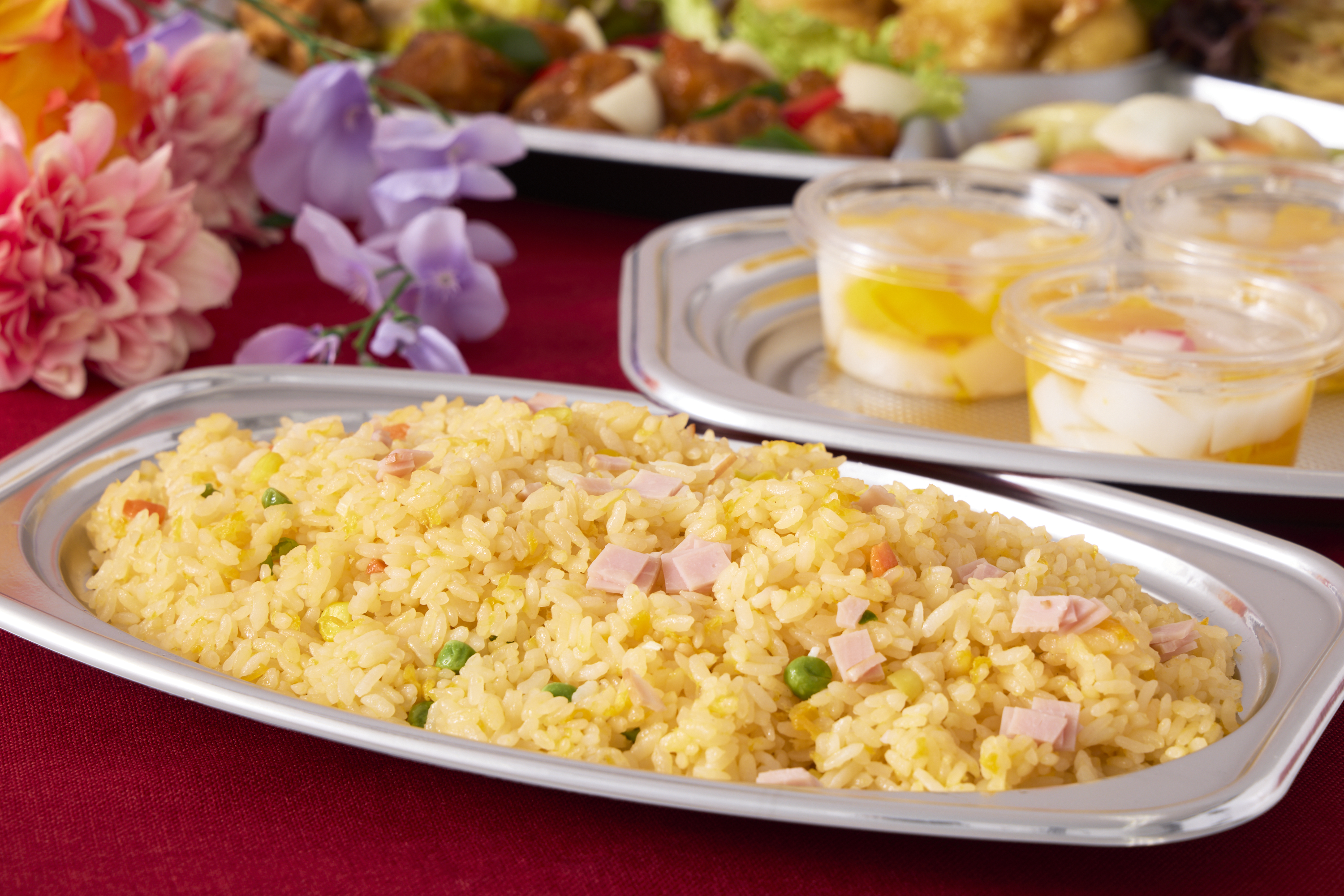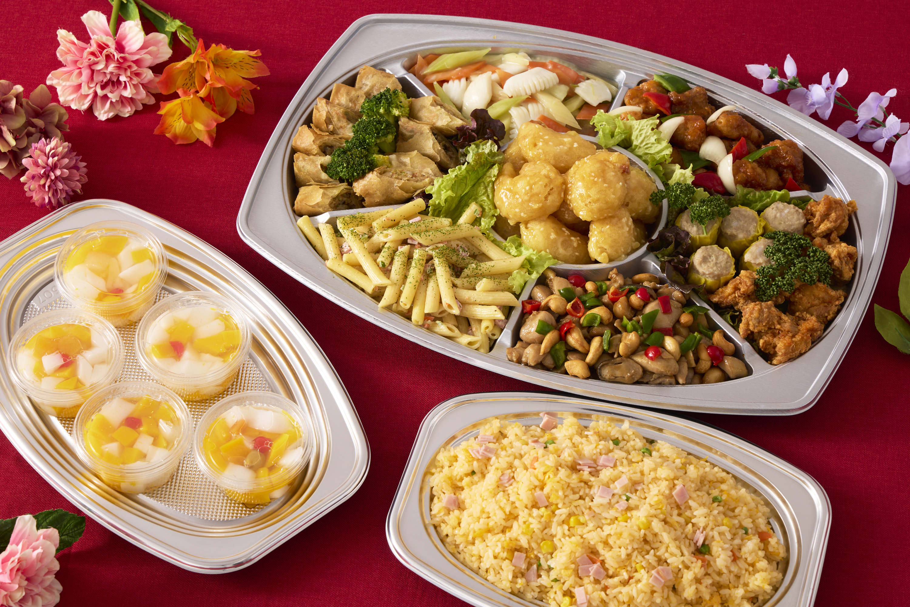 ・海鮮チャーハン ・伊勢佐木飯店特製から揚げ ・具たっぷり五目春巻き ・特製海老マヨネーズ ・黒酢酢豚 ・マカロニサラダ ・香港風肉シュウマイ ・カシューナッツと鶏の炒め物 ・いかの中華炒め 【春の特別プラスワン】 ・フルーツ杏仁豆腐 分量:基本 各1ピース/人、そのほかのお料理 80g前後/人 |
