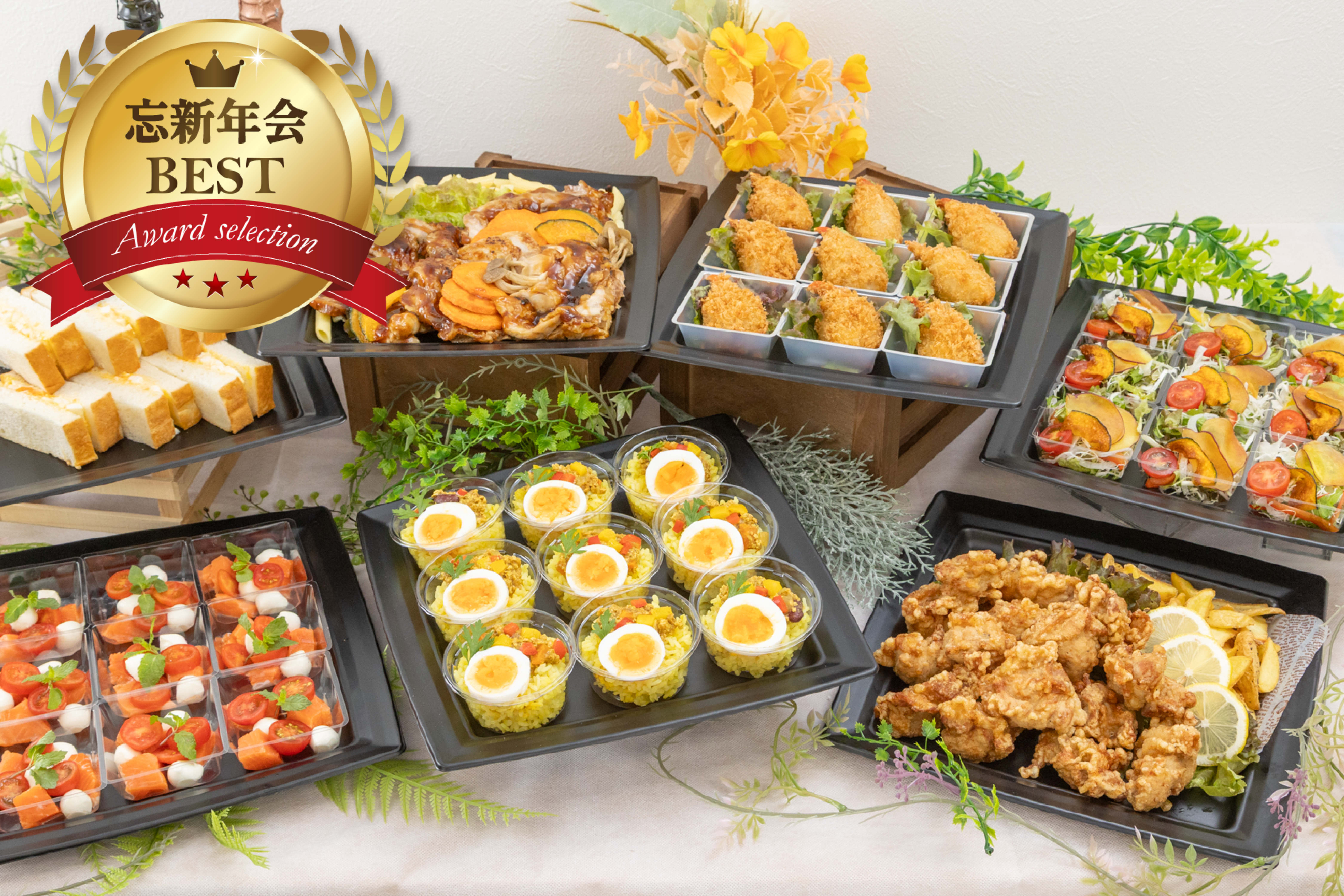 【7品】 ・さっくり 鶏のから揚げ&ポテトフライ (2個/人) ・ふわふわ卵サンド (1切れ/人) ・卵入りドライカレー (1個/人) ・季節の野菜サラダ (1カップ/人) ・オマールフライ(1個/人) ・照り焼きチキンステーキ(120g/人) ・サーモンとトマトのカプレーゼ(40g/人) |
