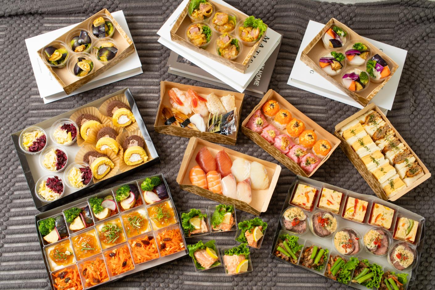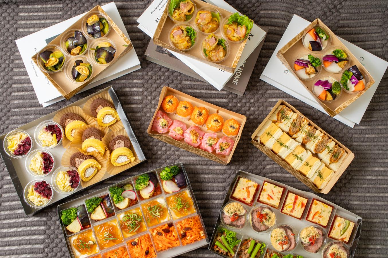 【メニュー内容】 ① 季節野菜のラタトゥイユ ② 自家製もちもち豆腐 ③ 大根マヨと芝漬けアッシェ ④ キャロットラペ ➄ 厚焼き玉子のサンドウィッチ ⑥ メンチカツのサンドイッチ ⑦和牛ローストビーフの和風マスタードソース ⑧スペインオムレツ ⑨ミニロールケーキ |
