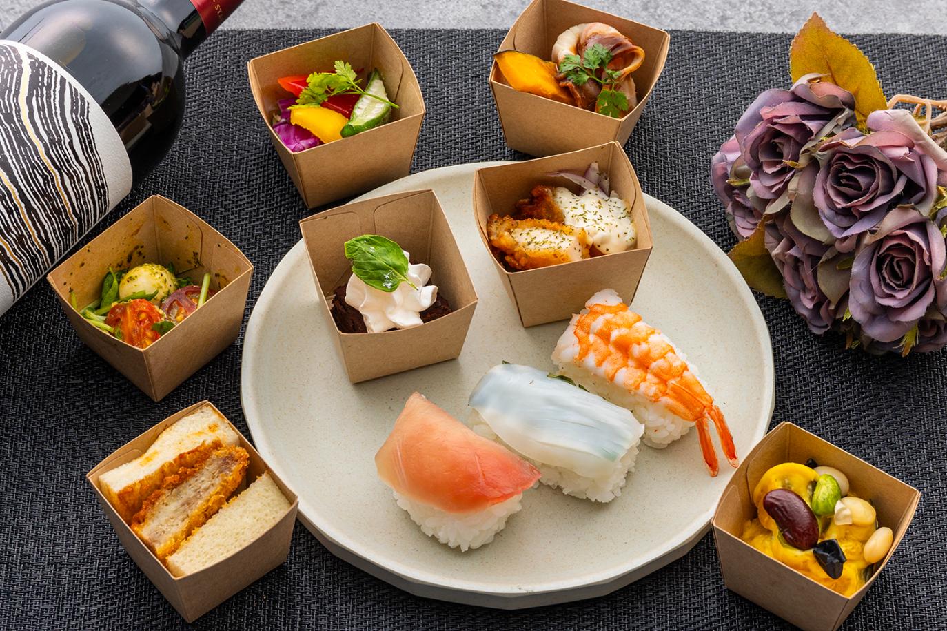 ▼MENU ・彩り野菜のバーニャカウダー ・かぼちゃのクリームサラダ ・ポークロティ~バルサミコソースをかけて~ ・クラシックデミカツサンド ・フレッシュカプレーゼ ・職人の定番握りずし(3貫) ・チキンフリット 南蛮スタイル ・ガトーショコラ クラシック ▼春限定のプラスワン! ・和牛のタリアータ |