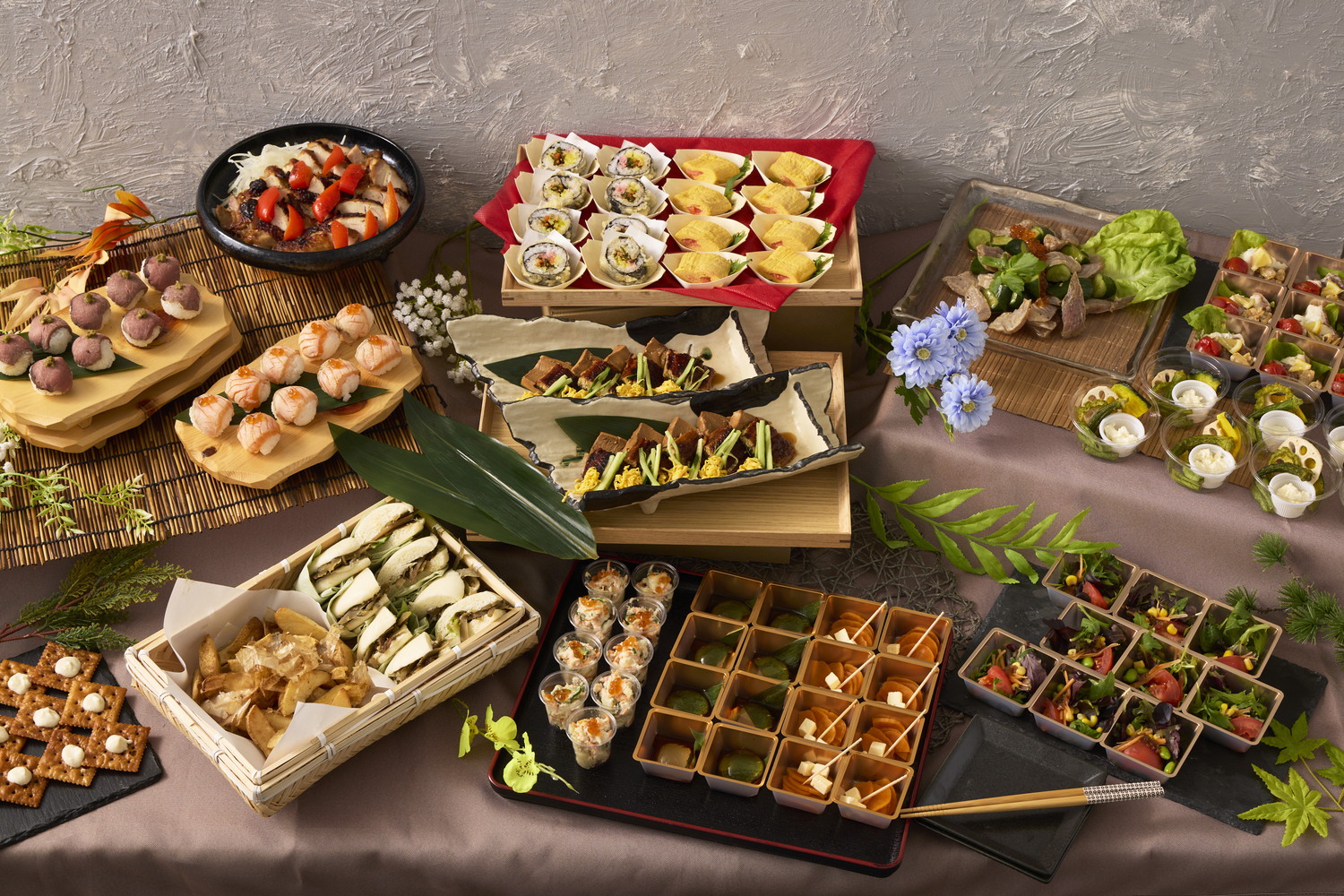 本鮪や和牛、鰻などの豪華食材が揃い踏みする、華やかでリッチなデリバリーオードブルをご用意しています。彩り豊かな手毬寿司や美しいデリなど、洗練されたビジュアルで上質な宴を演出。2,000円~4,000円というコスパ抜群の価格帯でありながら、元星付きの技術を凝縮した圧倒的な品数とクオリティを実現しました。